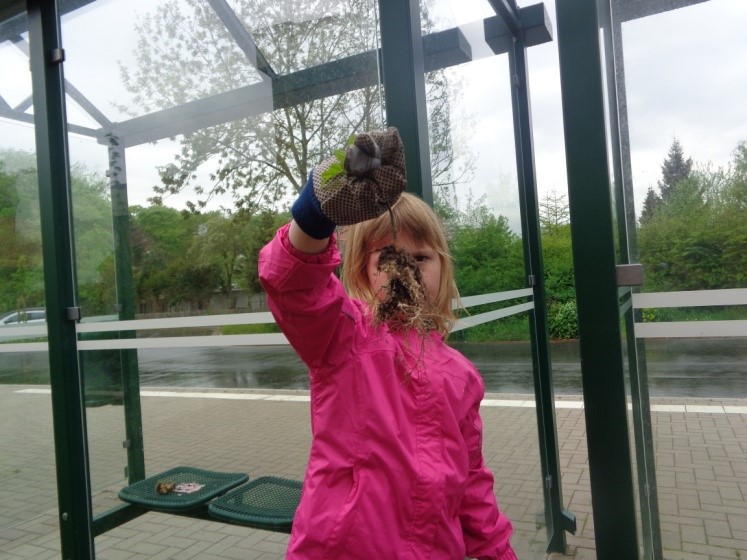 Auch bei der Bushaltestelle wurde fleißig Unkraut gezupft. Die Kinder erzählen von den langen Wurzeln, die da dran sind.