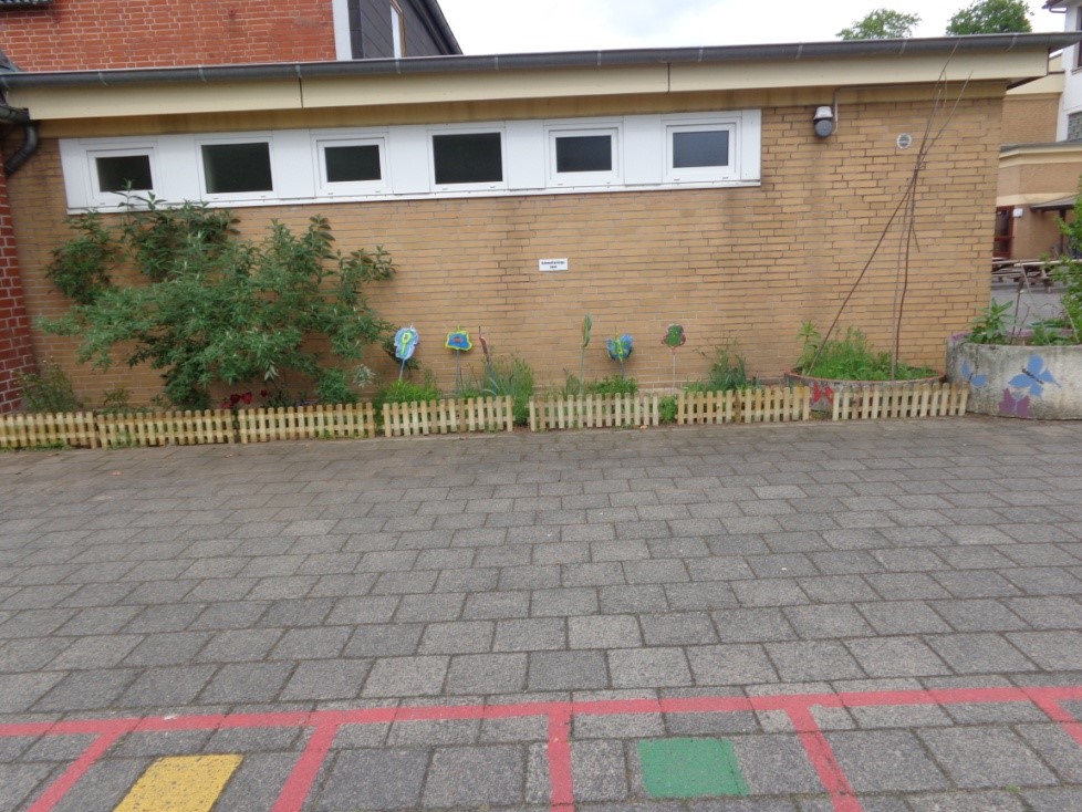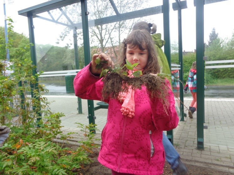 Auf dem Schulhof zur Straße wurde in den Beeten Unkraut rausgezupft. Danach wurde Storchenschnabel eingepflanzt.