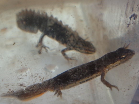 Beim Teich musste keiner arbeiten - alle durften forschen und entdecken. Und wie! Einen männlichen Teichmolch hatten sie schon. Er war im Hochzeitskleid. Mit Punkten und unten orange. Dann haben sie noch einen kleinen weiblichen dazu gefangen.