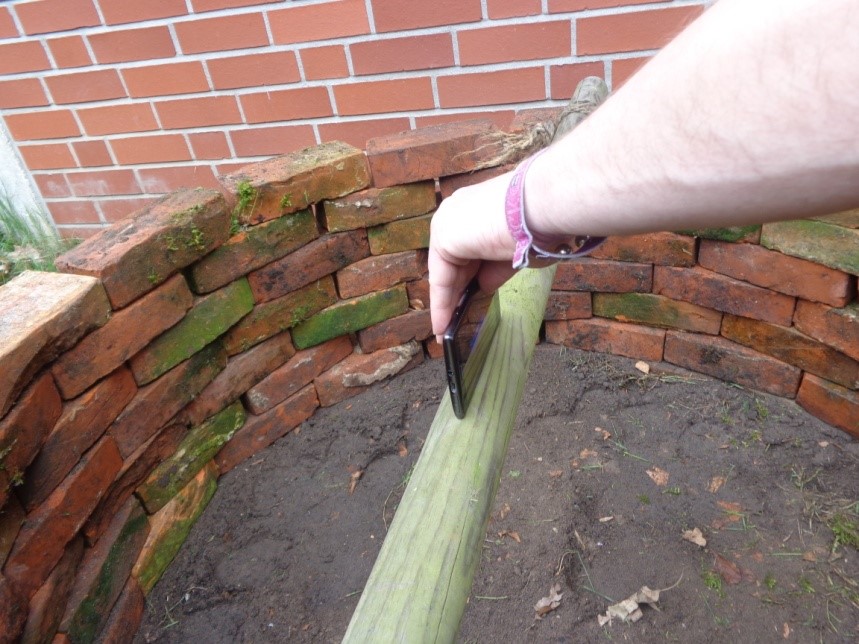 Drei Väter bauten ein neues Hochbeet aus alten Steinen. Das Fundament wurde in Matschepampe gelegt. Nun wurde weitergemauert. Eine Wasserwaage war im Handy.